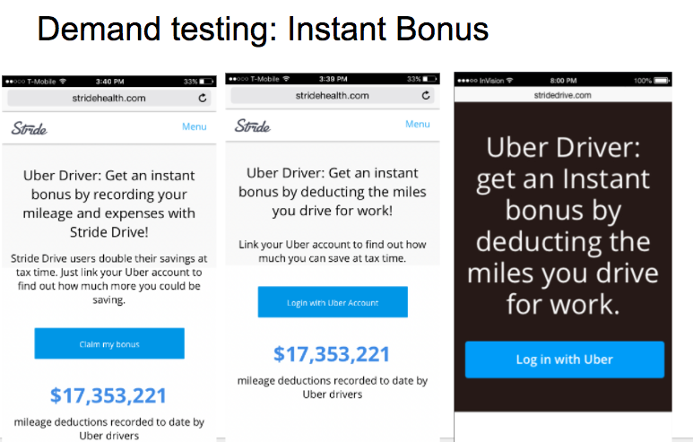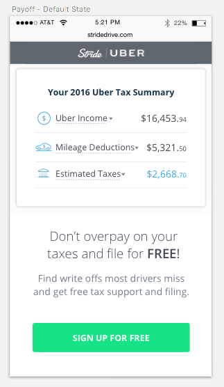 The Uber team LOVED this new product experience, and signed a new partnership deal. Stride will be the primary tax offering that was promoted by Uber in 2017, beating out TurboTax, H&R Block and Credit Karma Tax.
