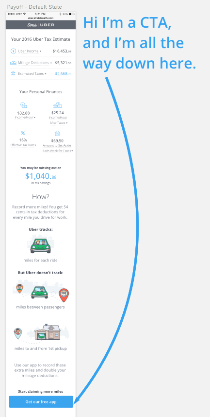 I made the design decision to include the CTA for download all the way below the tax savings and education. I believed that users always scroll, and will have gained enough trust and value to download Stride Drive.